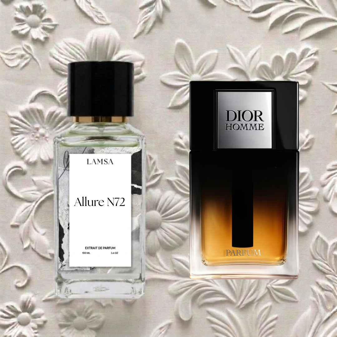 Allure N72 is a powerful and sophisticated fragrance inspired by Dior Homme Parfum. It opens with an elegant blend of iris and subtle freshness that feels refined and modern. As the fragrance unfolds, rich leather and warm woods create a deep and masculine character.