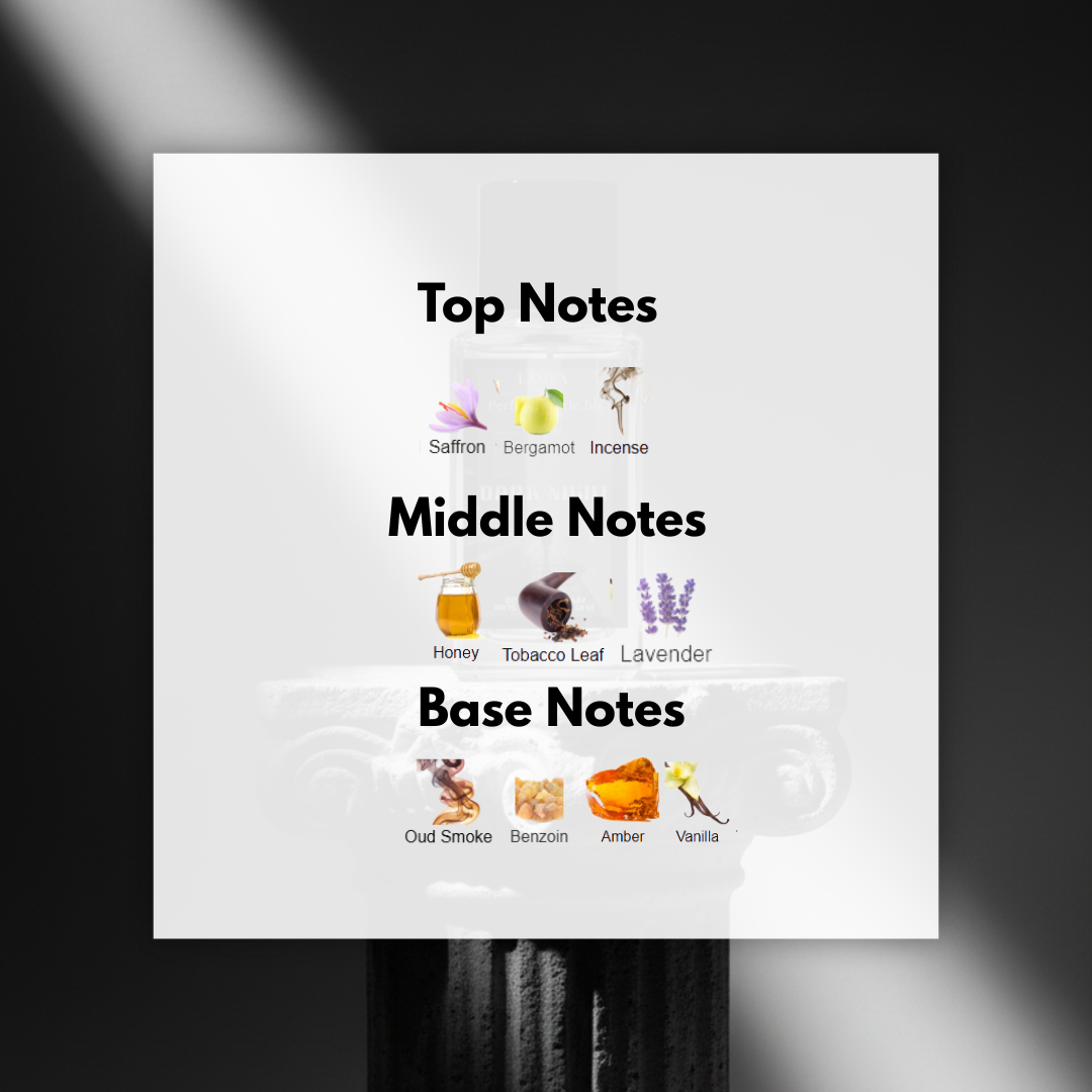 Dark Night is a fragrance shaped by shadow and fire. It opens with a commanding presence smoky, resinous, and quietly powerful like the moment the city sleeps and the night truly begins.